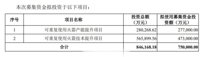 蓝箭航天在招股书(申报稿)中表示,公司IPO是为积极响应国家战略规划与迫切的市场需求、保持技术领先与核心竞争力优势,以及提升公司治理水平并持续为投资者和社会创造价值。拟募资的75亿元,用于可重复使用火箭技术、产能提升项目。